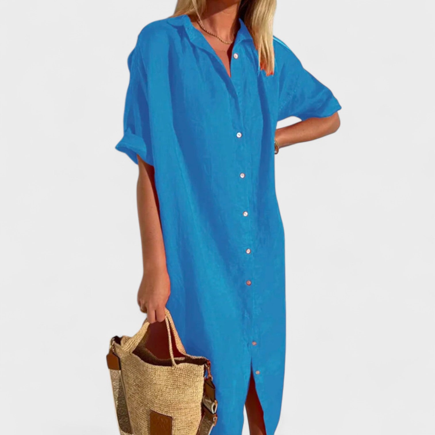 Deixe a primavera fluir com um vestido que combina sofisticação e leveza. Este modelo tipo chemise, com corte reto e botões frontais, traz uma silhueta descomplicada, perfeita para quem busca estilo sem esforço. O tecido leve garante conforto em dias quentes, enquanto o design versátil permite transitar com charme do passeio ao ar livre ao almoço casual com amigas. Um clássico moderno que nunca sai de moda.