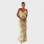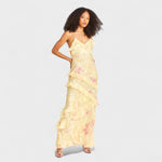 Este vestido longo é a verdadeira expressão de charme e feminilidade. Com um corte fluido e camadas de folhos estrategicamente posicionadas, valoriza a silhueta de forma subtil e elegante.