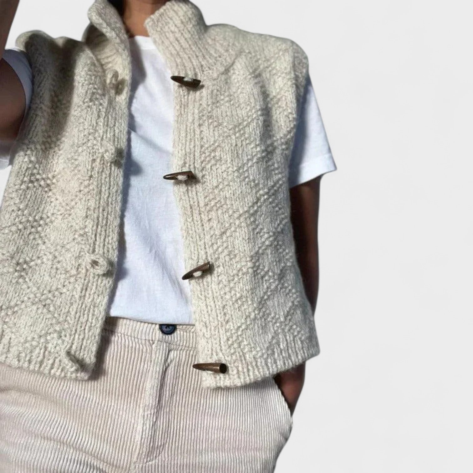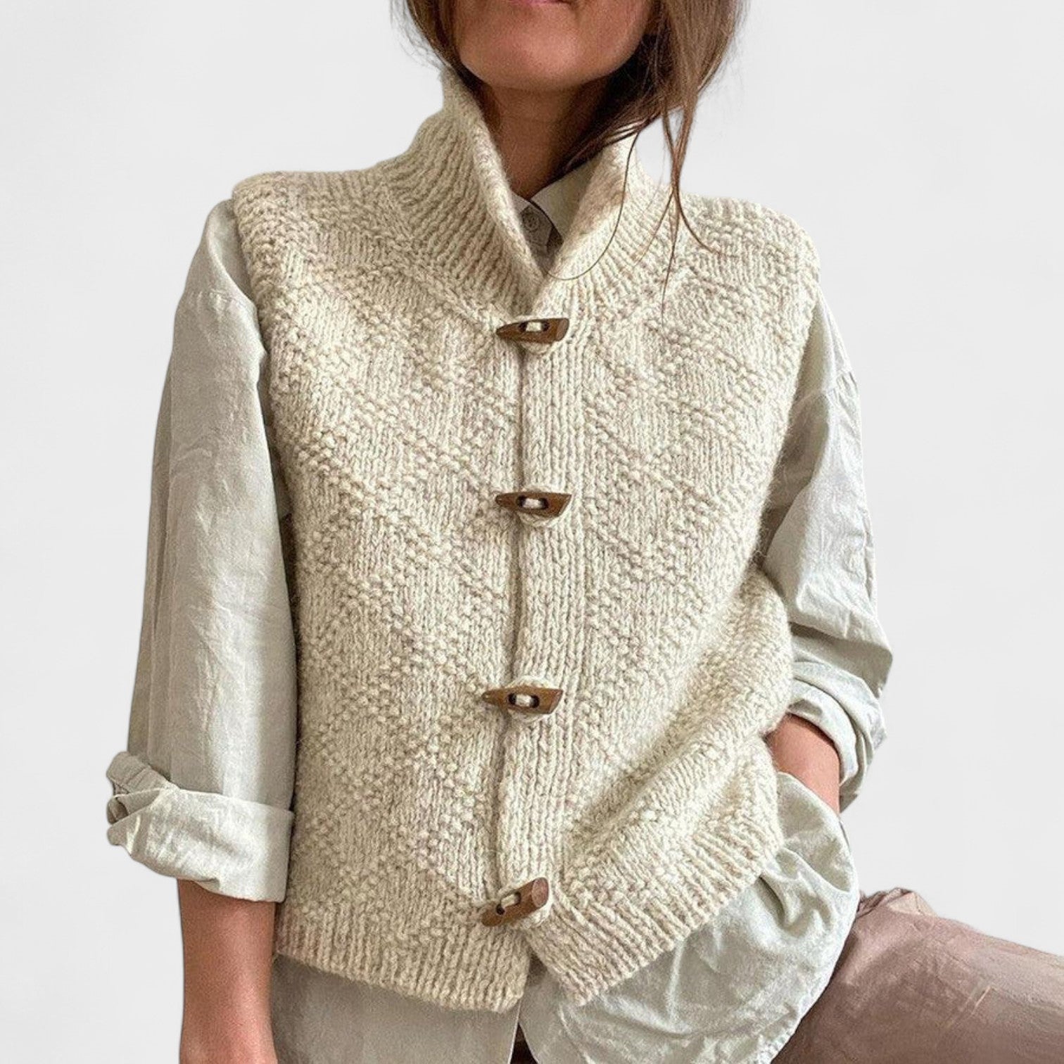 Transforme seus looks com este colete tricotado à mão, que une tradição e sofisticação em uma peça única. Com um design texturizado e botões rústicos de madeira, ele oferece um toque artesanal sem abrir mão da elegância. Ideal para sobrepor camisas ou blusas leves, é a escolha perfeita para quem valoriza peças autênticas e cheias de personalidade.
