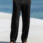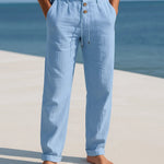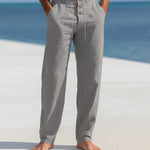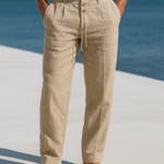 Estas calças de linho são o equilíbrio perfeito entre conforto e elegância. Com cintura ajustável, botões em destaque e corte relaxado, são ideais para dias de sol, passeios à beira-mar ou eventos ao ar livre com dress code informal e requintado.