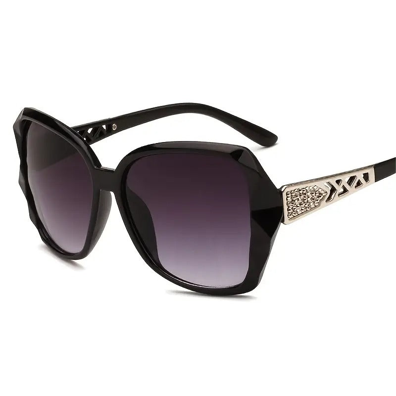 Óculos de sol com lente oversized de linhas facetadas e acabamento premium. As hastes exibem um aplique metálico com recortes geométricos e microbrilhos de inspiração joalheira, elevando instantaneamente qualquer look. Lentes com efeito degradé para conforto visual ao ar livre, armação leve e resistente para uso diário, e encaixe estável que valoriza o rosto com elegância.
