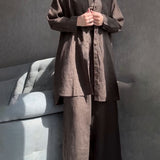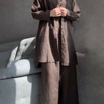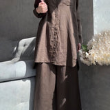 O conjunto é feito de 100% linho europeu de alta qualidade que respira com a sua pele e se move suavemente a cada passo. O conjunto é composto por uma blusa solta com fecho de botões e calças largas e confortáveis com cintura elástica. O resultado é um look elegante e descontraído que pode usar tanto num dia relaxante em casa como numa noite elegante fora.