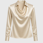 A Blusa Elegante combina a fluidez do tecido acetinado com o charme do decote em cascata, resultando num visual feminino, moderno e intemporal.