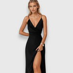 Com alças finas, decote cruzado e uma racha lateral que revela com classe, este vestido é a escolha certa para jantares especiais, festas ou qualquer ocasião onde o teu brilho pessoal deve ser o centro das atenções. O corte delicado abraça o corpo sem apertar, valorizando cada curva com suavidade.