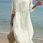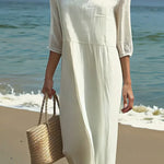 Um vestido fluido com decote quadrado e mangas 3/4 que abraça o corpo com conforto e elegância. O caimento solto alonga a silhueta e dá movimento a cada passo, seja na praia, num passeio de fim de tarde ou num jantar descontraído. A peça perfeita para quem quer sentir-se fresca, feminina e pronta para tudo.