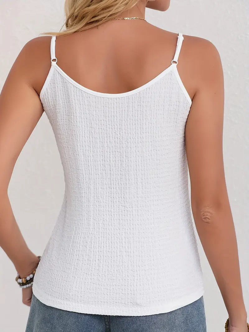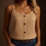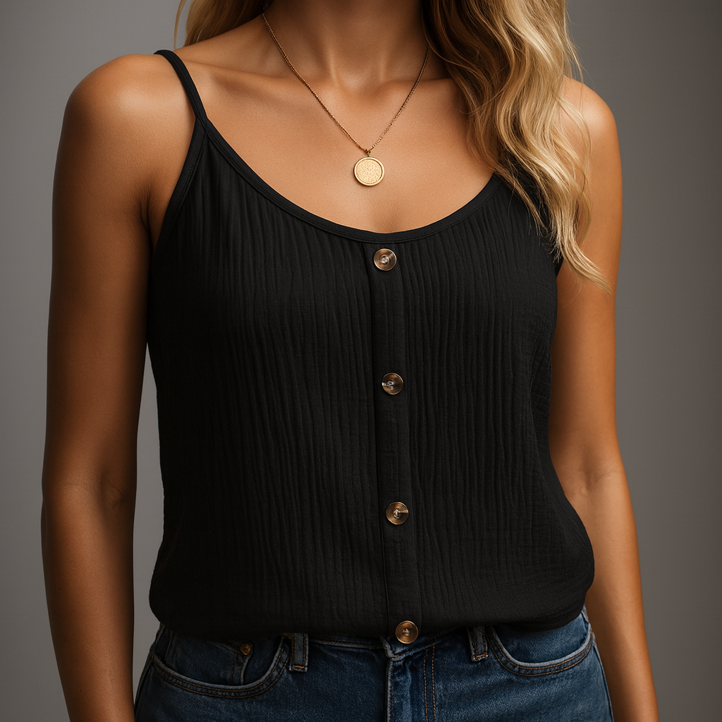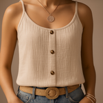 Um top leve e moderno que une praticidade e estilo em perfeita harmonia. O design com alças finas e a fileira de botões frontais traz um charme casual e elegante, ideal para dias descontraídos ou para composições mais sofisticadas quando combinado com acessórios.