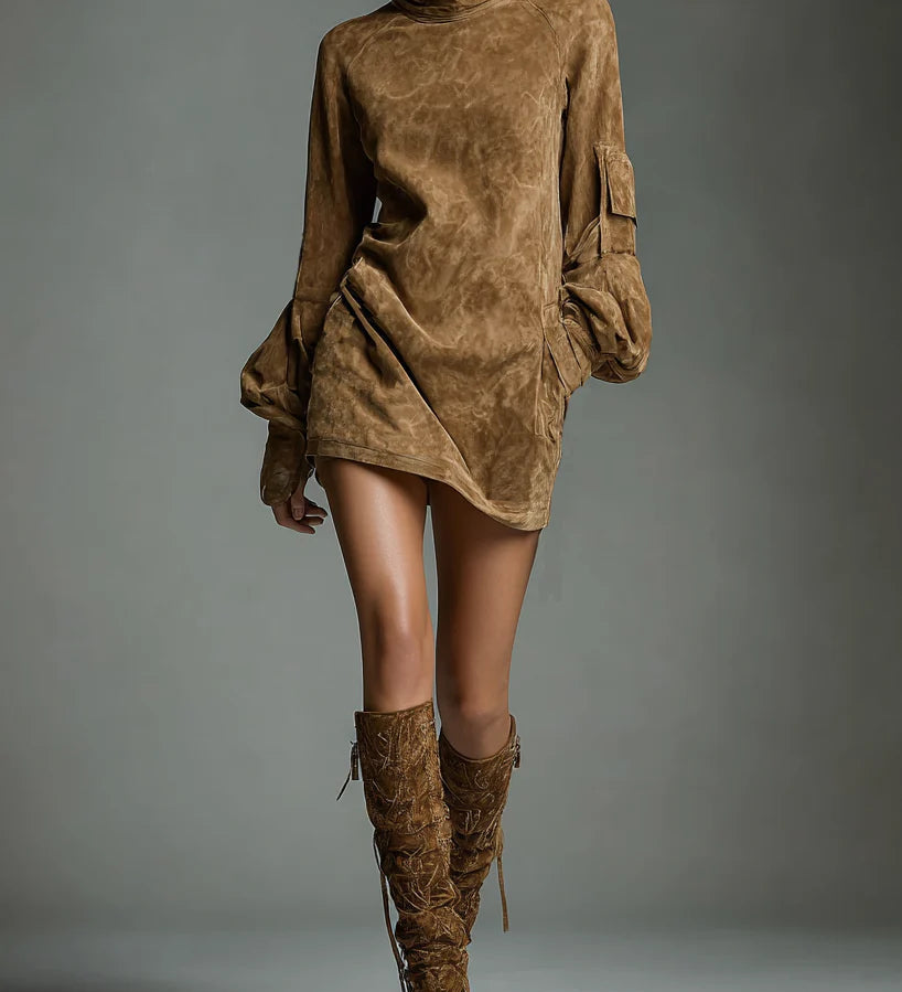 Margarida Lisboa™ - Minivestido Largo de Camurça com Gola Alta