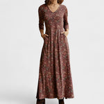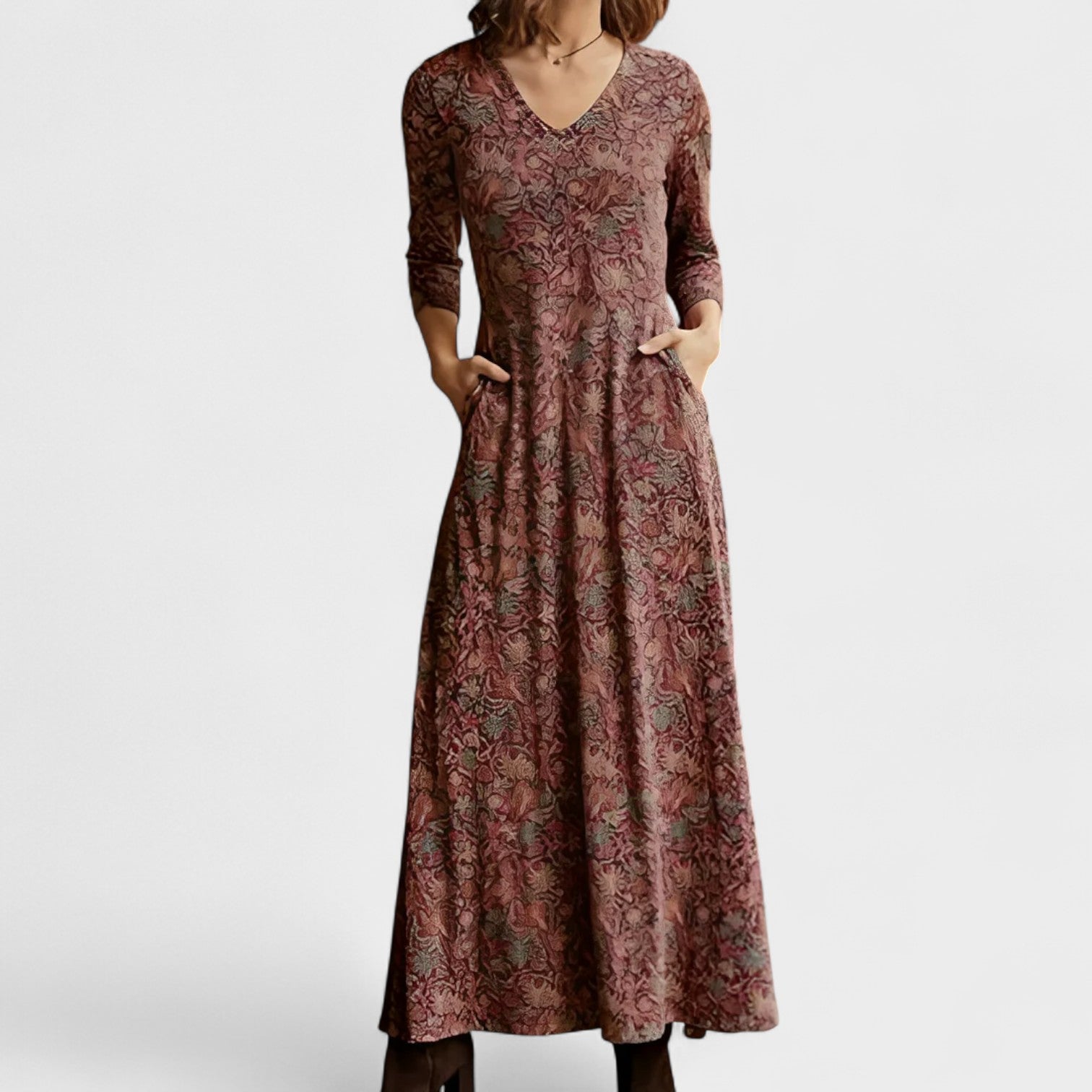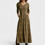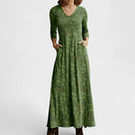 Com um corte elegante e estampa suave, este vestido de manga 3/4 é a definição de beleza prática. Seu tecido leve e textura delicada proporcionam conforto absoluto, enquanto o decote em V e o caimento alongado valorizam a silhueta com discrição e feminilidade.