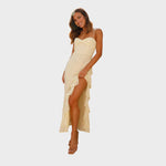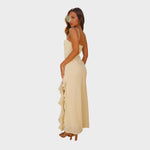 Com alças finas, decote suave e um elegante folho assimétrico na abertura lateral, transmite frescura, leveza e feminilidade. O tecido fluido abraça o corpo com suavidade, criando uma silhueta delicada e sensual. Ideal para casamentos, festas de verão ou escapadelas românticas.