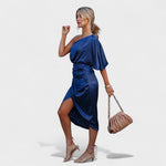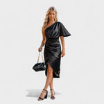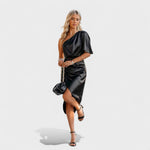 Este vestido midi em cetim é o equilíbrio perfeito entre sofisticação e ousadia. Com um ombro só e drapeado estrategicamente posicionado, valoriza a silhueta de forma subtil mas impactante. O brilho acetinado do tecido confere-lhe um toque de luxo ideal para ocasiões especiais — desde jantares elegantes a eventos noturnos. Uma peça que transforma qualquer entrada numa afirmação de estilo.