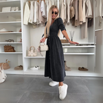 Quer também mostrar-se da sua melhor maneira? Aqueles momentos em que se sente completamente confortável e recebe elogio após elogio. Este vestido elegante faz exatamente isso por si! Com os seus botões de pressões e laços nas mangas, vai certamente atrair olhares!