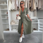 • Modelo que valoriza a silhueta – O decote em V, a cintura ajustada e a fenda na saia criam um efeito alongador, destacando a silhueta sem ser apertado demais.