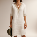 O vestido  é a peça que traduz sofisticação e conforto num só look. Com um corte leve e fluido, aliado a detalhes artesanais no decote e mangas, é ideal para quem procura uma elegância descontraída, perfeita tanto para passeios à beira-mar como para encontros especiais. A sua versatilidade permite usá-lo em momentos casuais ou em ocasiões mais refinadas, mantendo sempre um charme autêntico e intemporal.
