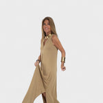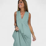 Com corte fluido e decote em V é a definição de sofisticação prática. Com uma racha lateral discreta e um design sem mangas, valoriza a silhueta e proporciona conforto total. É a escolha perfeita para quem procura uma peça versátil que transita do dia para a noite com naturalidade. Seja para um jantar elegante, um evento especial ou um passeio casual com estilo, este vestido adapta-se a qualquer ocasião com classe.