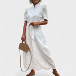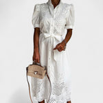 Este vestido midi é o epítome da frescura primaveril com um toque de romantismo. Com bordados delicados em estilo inglês, mangas curtas bufantes e uma cintura marcada por um laço subtil, é uma peça que transmite feminilidade, charme e elegância natural. Ideal para dias de sol, passeios ao ar livre ou eventos descontraídos com estilo.