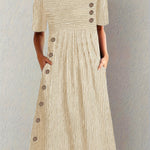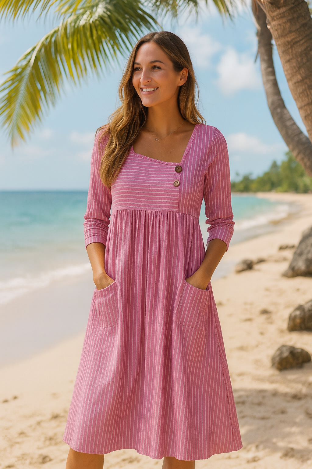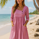 Deixe-se envolver pela leveza, conforto e estilo intemporal com Margarida Lisboa™ - Vestido de verão às riscas. Uma solução arejada e lisonjeira para dias quentes, onde se sentirá confortável e terá um aspeto fantástico. Perfeito para mulheres que desejam esconder a barriga sem comprometer a elegância.