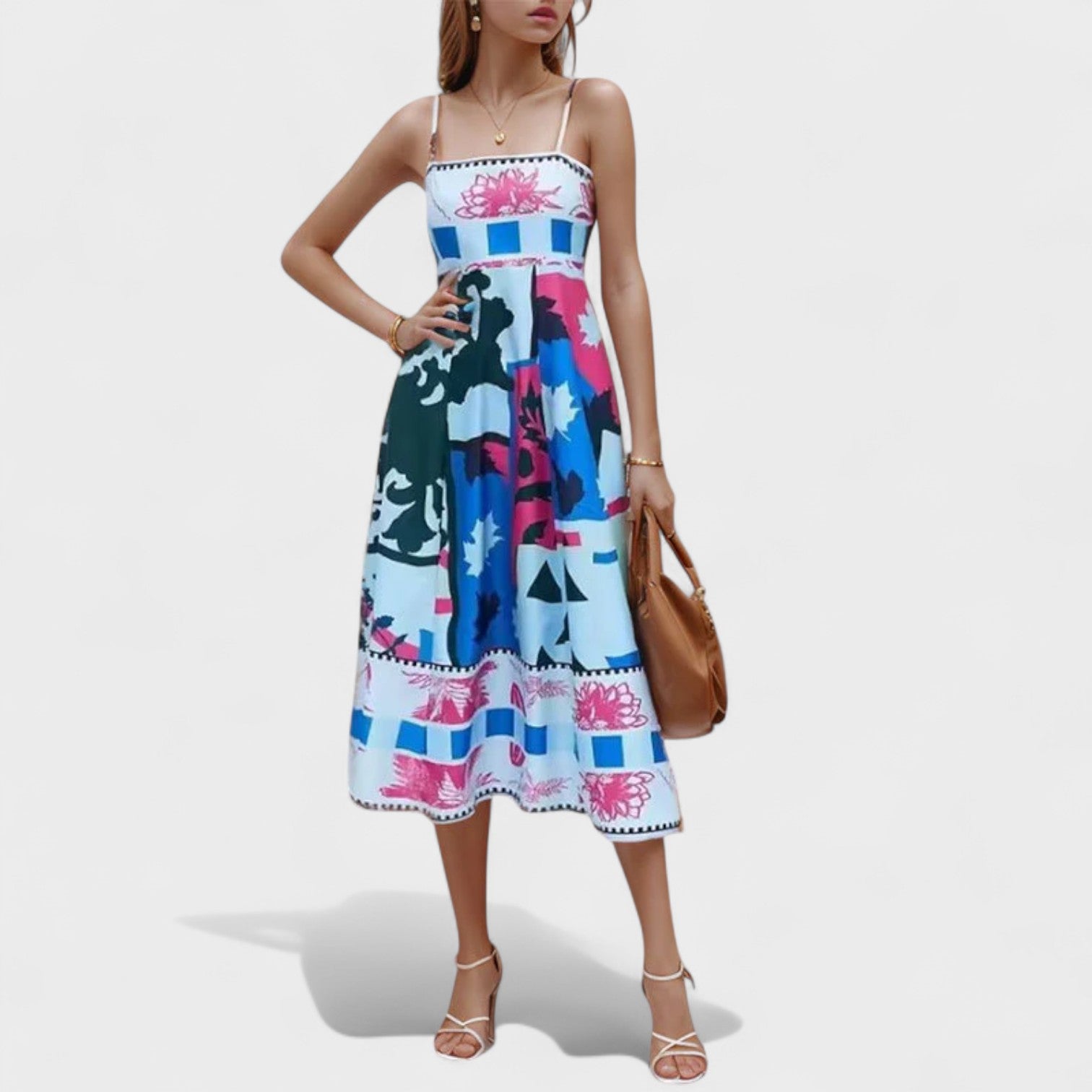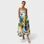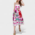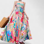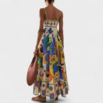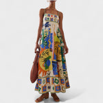 Este vestido longo é uma verdadeira galeria de arte vestível, combinando elegância com uma explosão criativa de estampas inspiradas em ilustrações modernas. Com modelagem fluida e alças finas delicadas, ele valoriza a silhueta com sofisticação e leveza. Ideal para quem deseja expressar estilo com originalidade, seja em eventos diurnos, culturais ou momentos especiais.