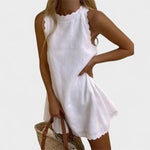 Este vestido curto preto é a peça-chave para um look leve, elegante e prático nos dias mais quentes. Com um corte simples e fluído, destaca-se pelos acabamentos ondulados na gola, cavas e bainha — um detalhe subtil que adiciona charme sem exageros. Ideal para combinar com sandálias, alpercatas ou até um chapéu de palha, é perfeito tanto para a praia como para um passeio descontraído na cidade. Um clássico renovado, pensado para mulheres que valorizam conforto e bom gosto.