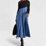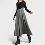 Este vestido longo é uma verdadeira peça-chave para a primavera, com o seu corte fluido, mangas compridas e design bicolor que combina elegância e conforto num só look. O decote cruzado e a cintura ligeiramente marcada criam uma silhueta graciosa, enquanto o tecido leve e estruturado garante movimento e charme em cada passo.