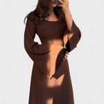 Este vestido longo de malha é a escolha ideal para quem procura um look sofisticado com um toque moderno e confortável. O corte justo realça delicadamente a silhueta, enquanto o tecido canelado oferece elasticidade e um caimento perfeito. Com mangas compridas e um design intemporal, adapta-se facilmente do dia para a noite — basta mudar os acessórios.