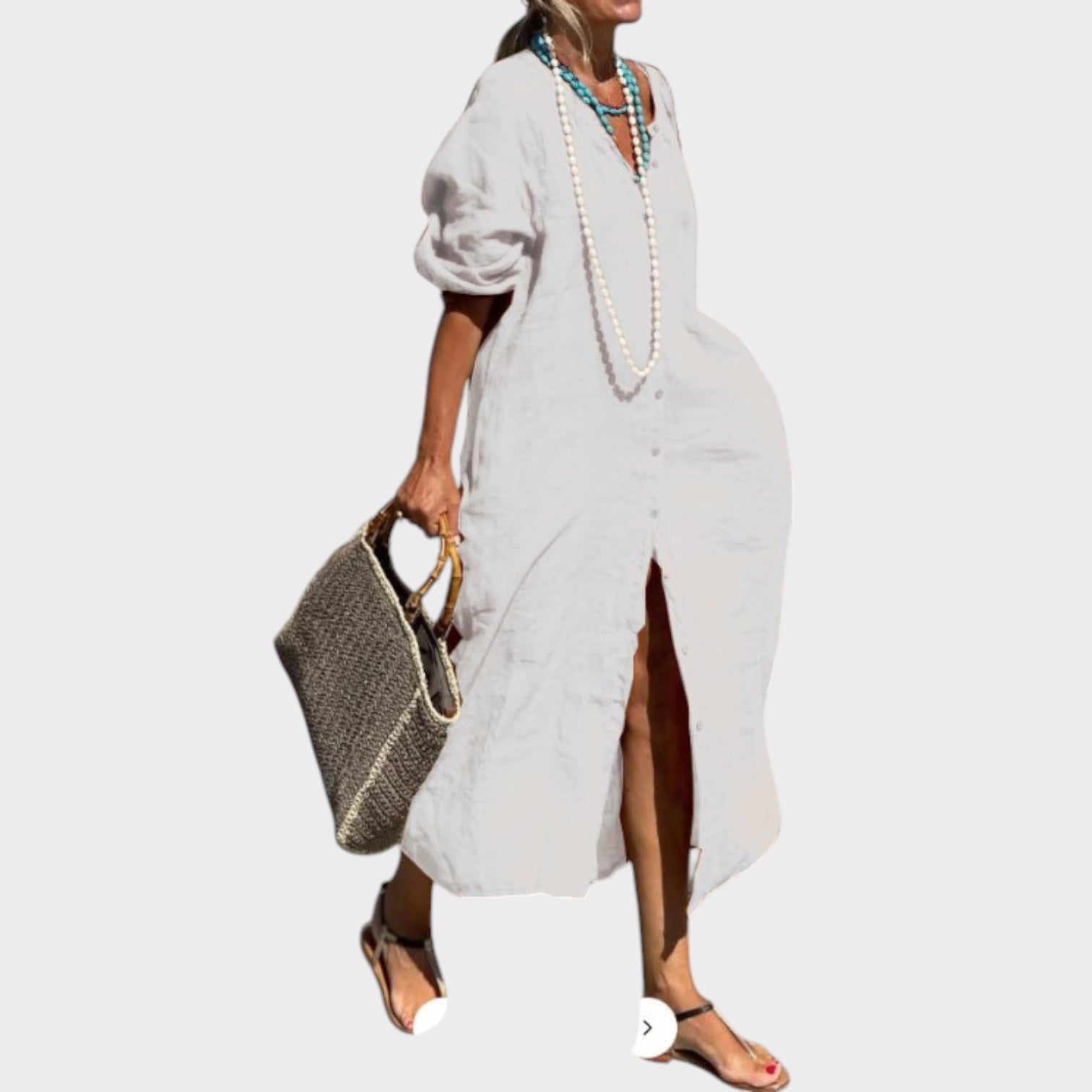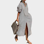 Entre na elegância do verão com o vestido de linho de algodão de corte solto. Experimente o epítome da elegância com este vestido comprido de linho, concebido com botões elegantes e um conforto arejado. Perfeito para os dias de sol e as noites amenas, o vestido Vera é o seu melhor modelo de verão.