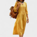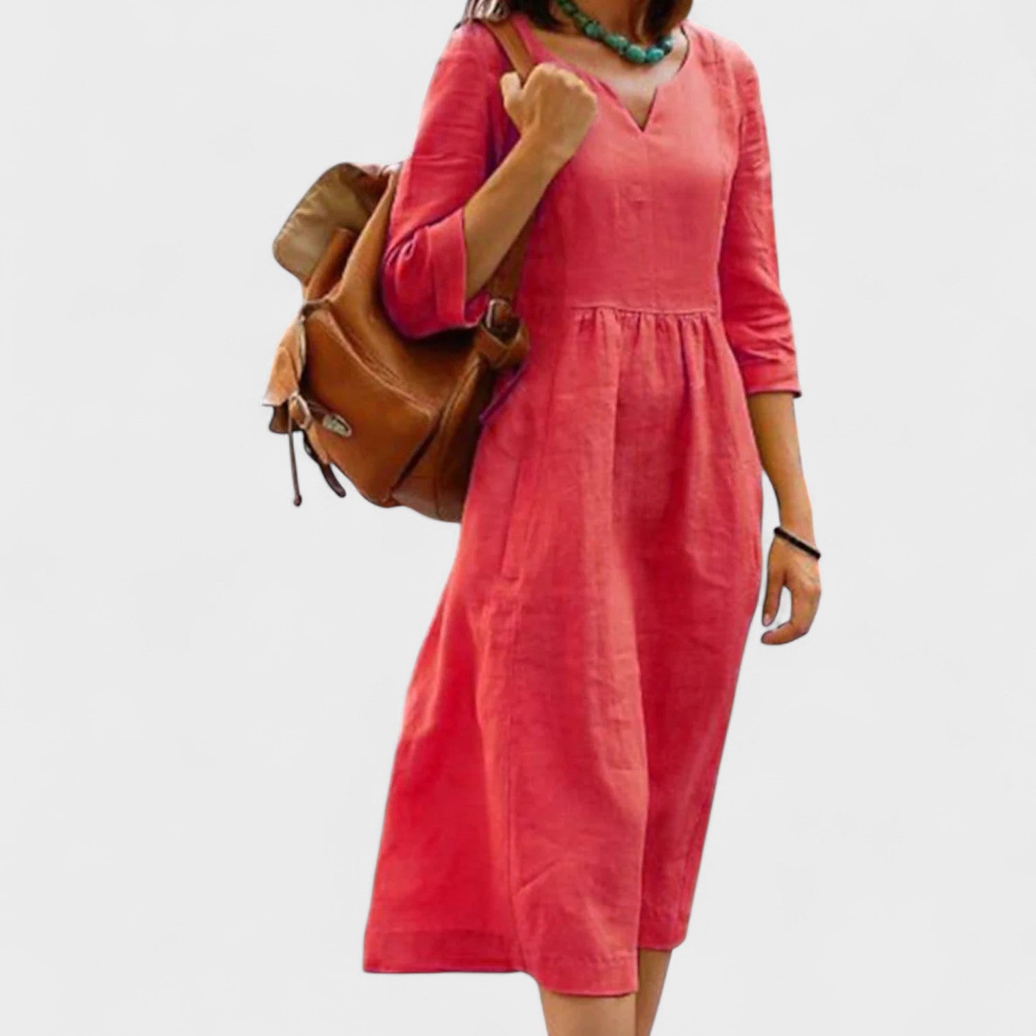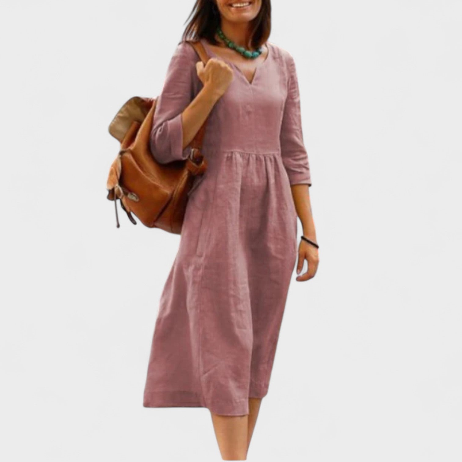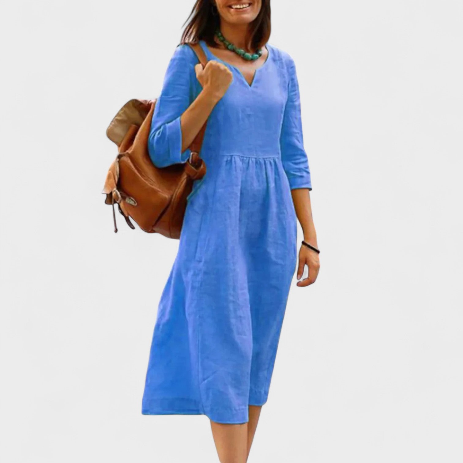 Descubra o equilíbrio perfeito entre conforto e estilo com este vestido de corte midi e mangas 3/4. Feito em tecido leve e respirável, ele é ideal para te acompanhar em qualquer ocasião — do passeio casual ao encontro descontraído. Seu design com cintura marcada e decote discreto valoriza a silhueta de forma natural, sem abrir mão da liberdade de movimento. Um visual autêntico e feminino que combina com você!