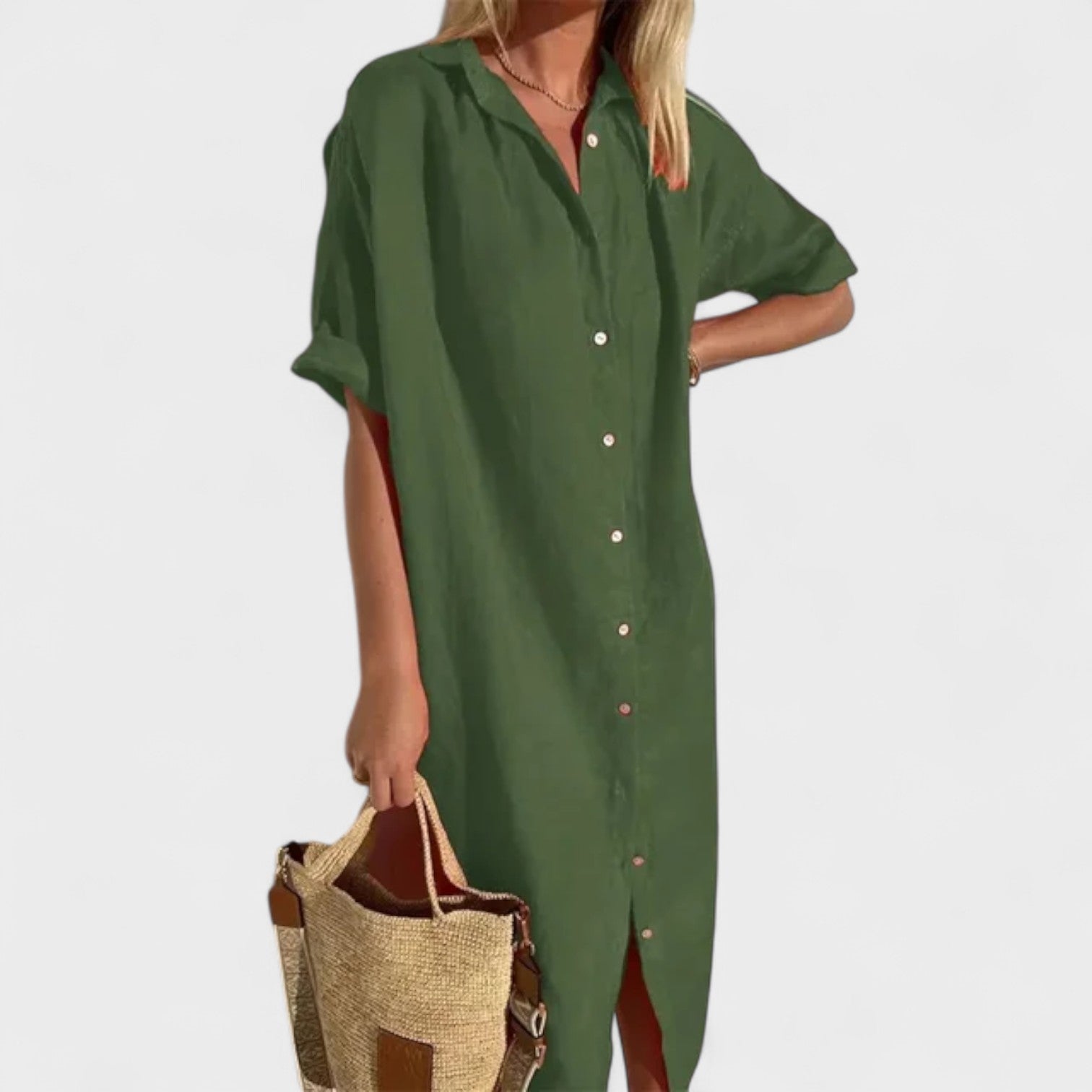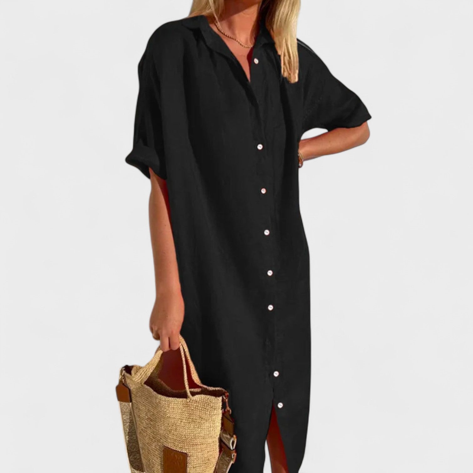 Deixe a primavera fluir com um vestido que combina sofisticação e leveza. Este modelo tipo chemise, com corte reto e botões frontais, traz uma silhueta descomplicada, perfeita para quem busca estilo sem esforço. O tecido leve garante conforto em dias quentes, enquanto o design versátil permite transitar com charme do passeio ao ar livre ao almoço casual com amigas. Um clássico moderno que nunca sai de moda.