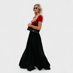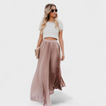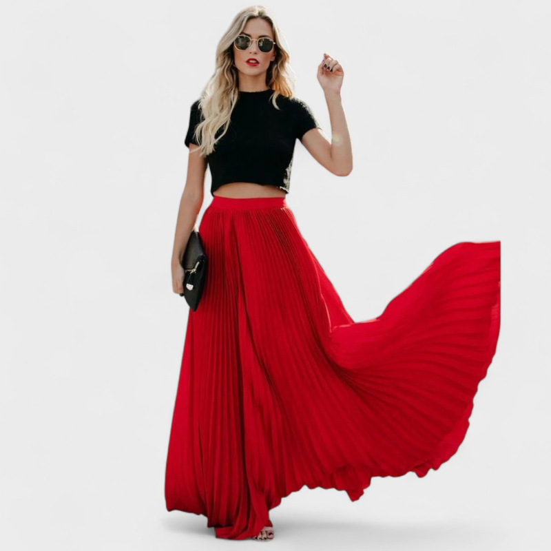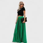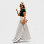Esta saia longa plissada combina fluidez e sofisticação como nenhuma outra. Com um corte leve e esvoaçante, cria um efeito visual hipnotizante enquanto se movimenta, transformando qualquer simples passeio numa entrada triunfante. Perfeita para quem deseja destacar-se com classe, mantendo sempre um toque moderno e casual.