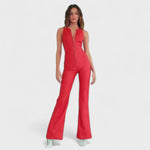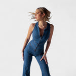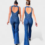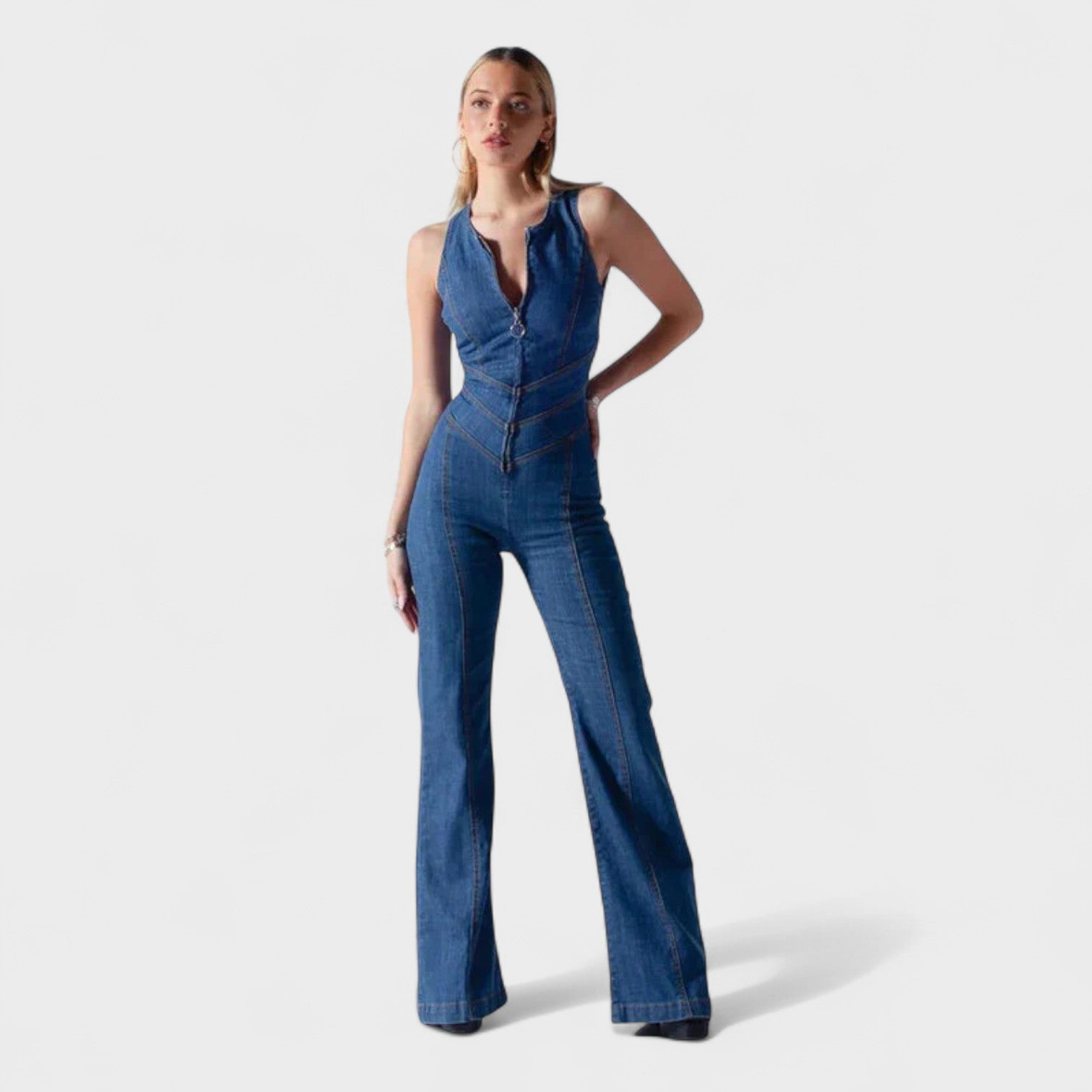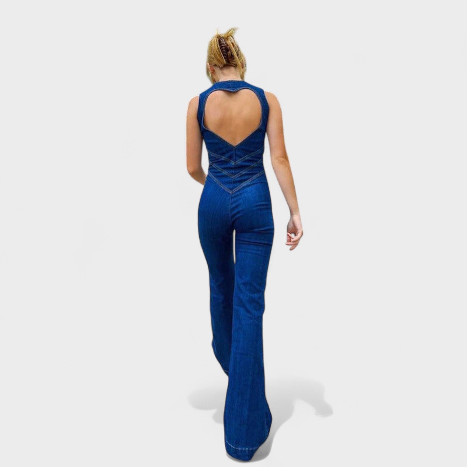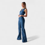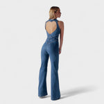 Este macacão em ganga é a peça-chave para quem quer marcar presença com elegância e personalidade. Com um corte justo que valoriza a silhueta e pernas em ligeiro formato flare, este modelo alia um toque retro à modernidade do design.