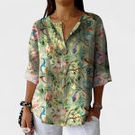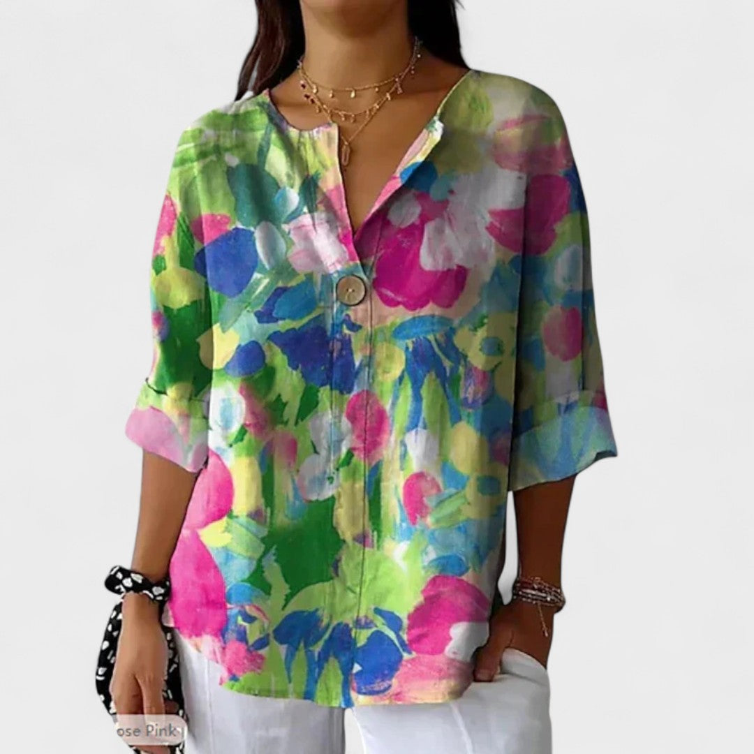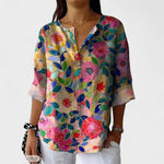 Esta blusa floral é mais do que uma peça de roupa – é uma explosão de cor e alegria que transforma qualquer visual. Com um corte descontraído e elegante, esta peça combina o charme do vintage com o conforto moderno. Ideal para dias ensolarados ou para dar um toque de frescura aos teus looks mais neutros.